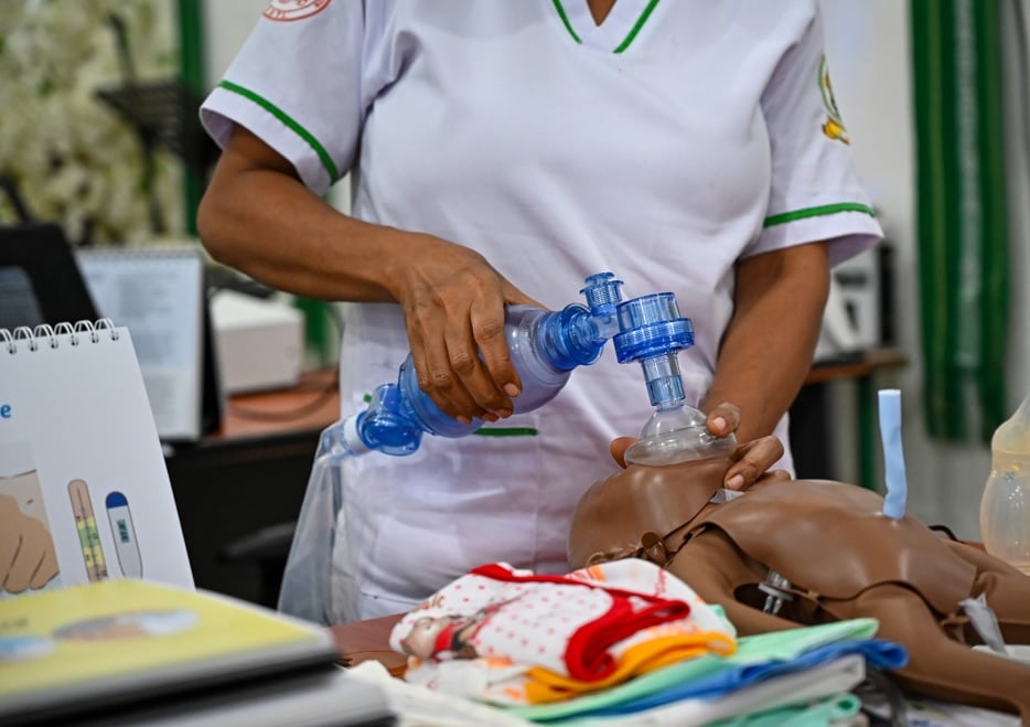 A health worker practices using the Bag Valve Mask (BVM) during the Essential Newborn Care Course training at Hospital Nacional Guido Valadares (HNGV) in Dili, Timor-Leste. WHO Photo/Emilia Moniz