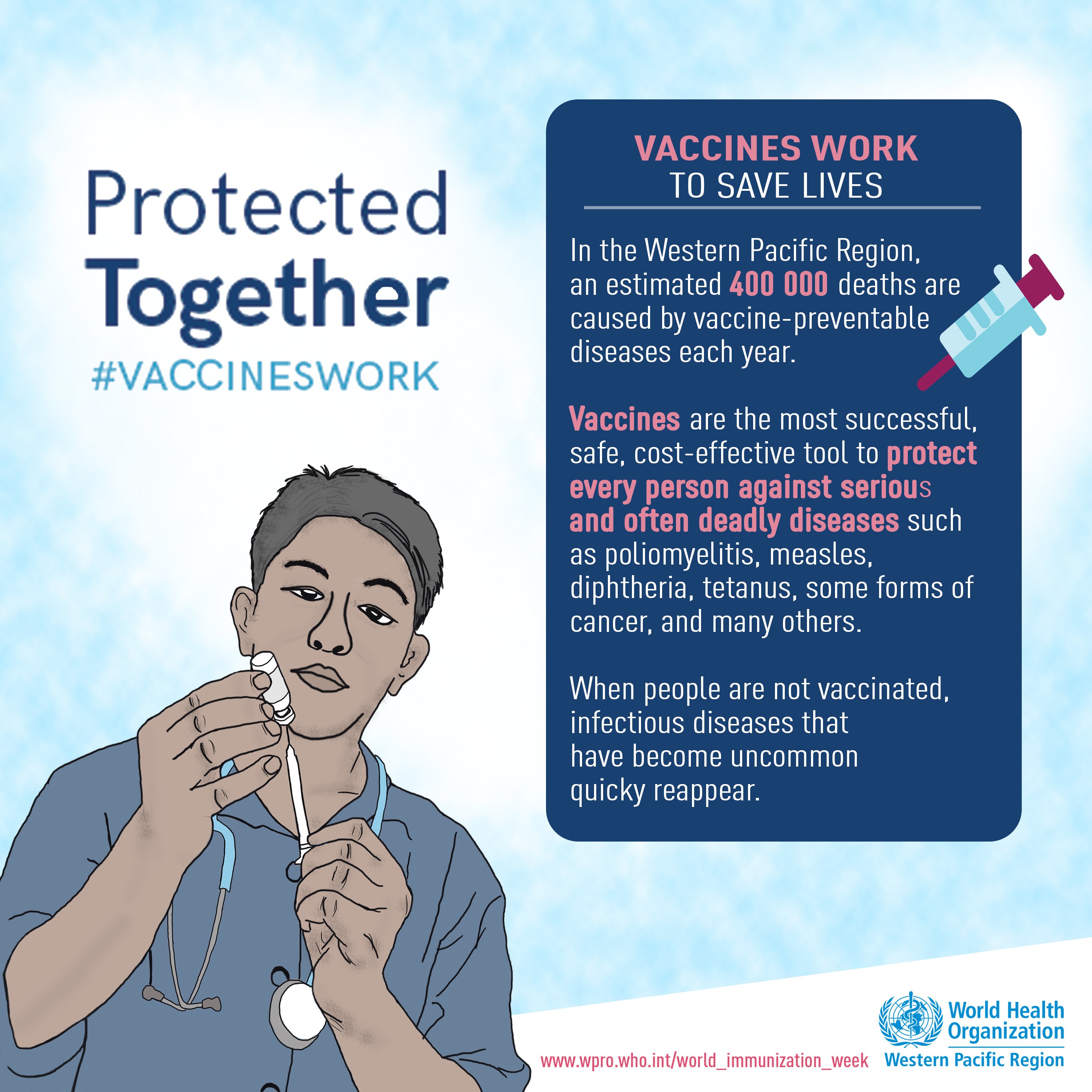 Immunization saves millions of lives and is widely recognized as one of the world’s most successful and cost-effective health interventions. Vaccines save up to 3 million lives each year worldwide from infectious diseases, such as hepatitis, diphtheria, tetanus, pertussis (whooping cough), measles and polio. Still, despite the proven effectiveness of vaccines and the tens of millions of lives they have saved, an estimated 400 000 people die needlessly every year in the World Health Organization’s (WHO’s) Western Pacific Region from diseases that vaccines could prevent. In the Region every year, up to 800 000 children go unvaccinated and more than 3.2 million children live in districts with immunization coverage of less than 80%.
